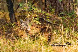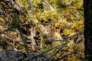 - Juvenile Bobcat watching from cover of the trees.